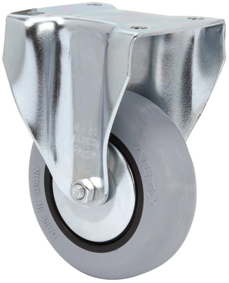 Rodas de borracha injetada na cor cinza. Especialmente adequadas para suportar cargas de até 70 kg.