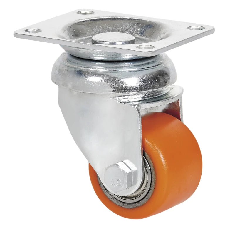 Rodas com núcleo metálico e banda de rodagem em poliuretano vulcanizado com dureza de 95° Shore A. Especialmente adequadas para suportar cargas de até 100 kg com altura mínima.