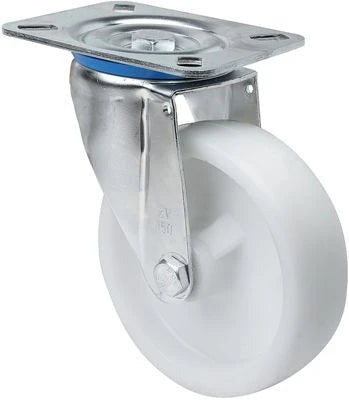 Roda de poliamida branca, especialmente indicada para suportar cargas elevadas de até 400 kg.
