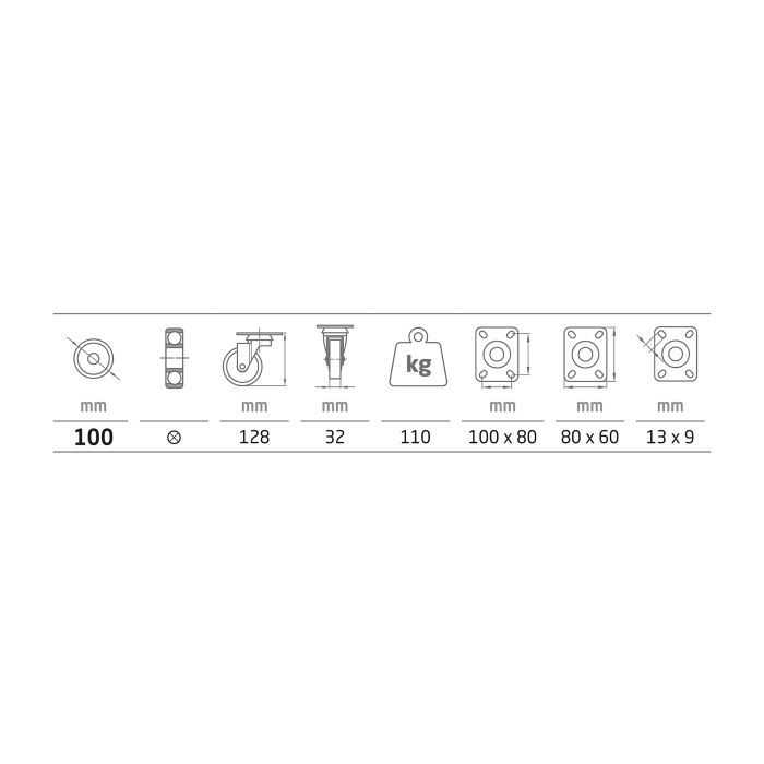 Roda com placa metálica fixa. Banda de borracha cinzenta de borrachas te rmoplástica. Núcleo de polipropileno com rolamento de esferas. Uso semi-industrial.