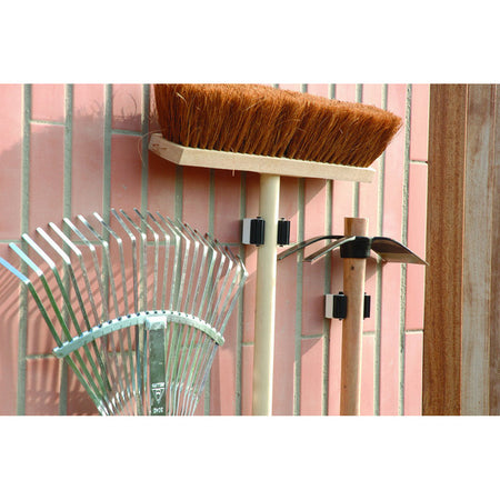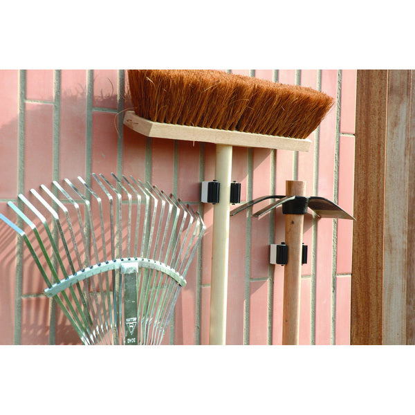 Cabide para vassouras em aço inoxidável ou aço laqueado. Inclui roletes de borracha giratórios para facilitar a colocação e uma aderência perfeita nos cabos.