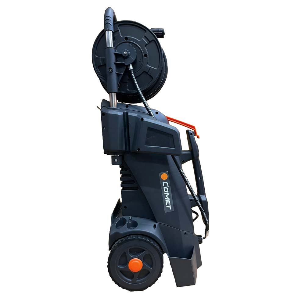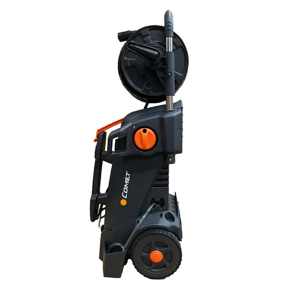 Lavadora de alta pressão Comet com bomba axial de latão, três êmbolos de aço inoxidável e válvula de bypass integrada. Acompanha todos os acessórios.