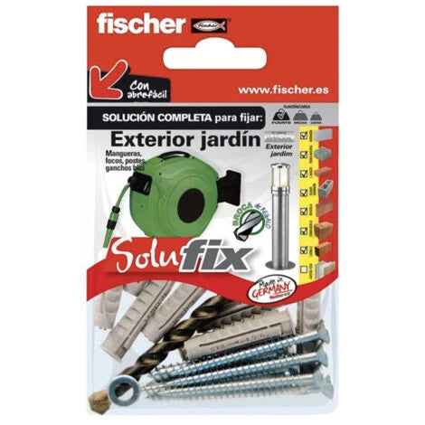 Kit de fixação para jardim externo 568681 solufix fischer kit de fixação solufix focado na montagem de acessórios de jardim, mangueiras, holofotes, postes, etc. inclui 8 plugues sx 8x40mm, 6 parafusos de aço inoxidável 5x50mm, 4 parafusos de fixação de aço inoxidável 6x50mm, 4 arruelas a2 m6 e 1 broca número 8.