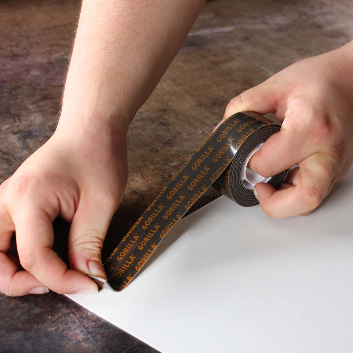 Aplique a fita adesiva na vertical na parte de trás do objeto. Corte fita adesiva à medida: utilize 10,2 cm de Fita Dupla Face por 454 g de peso. Pressione para fixar a fita adesiva ao objeto.