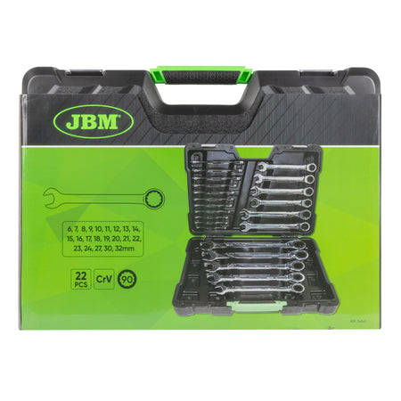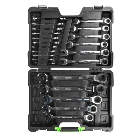 O conjunto inclui chaves nos seguintes tamanhos: 6, 7, 8, 9, 10, 11, 12, 13, 14, 15, 16, 17, 18, 19, 20, 21, 22, 23, 24, 27, 30 e 32 mm.