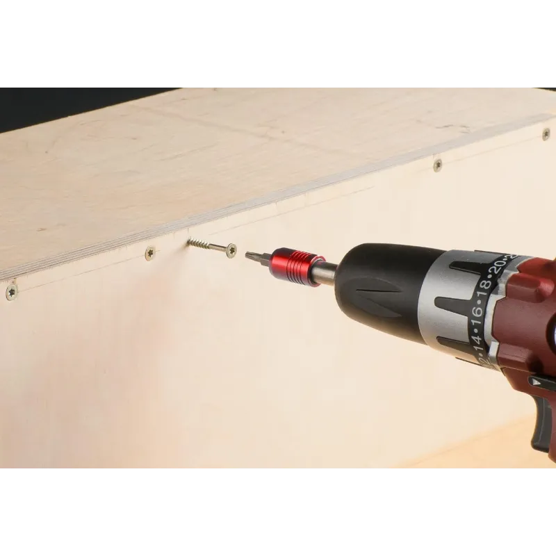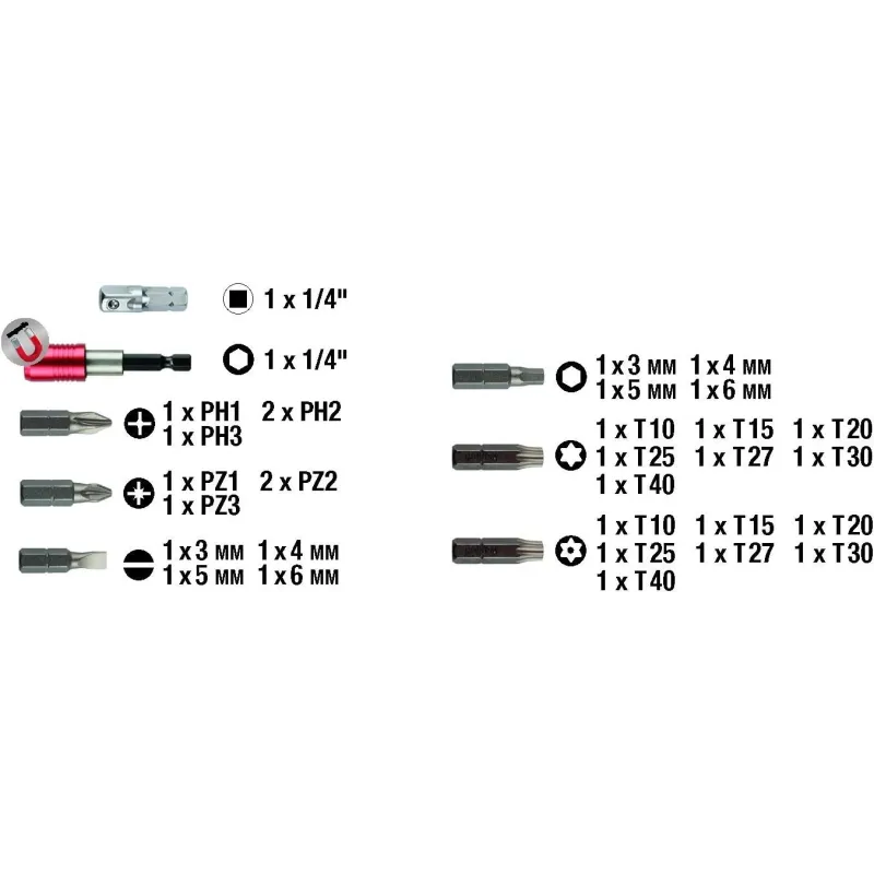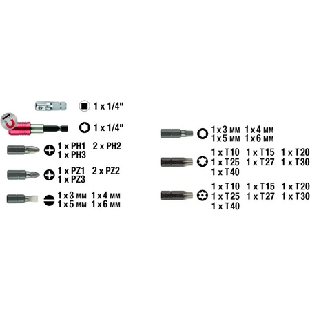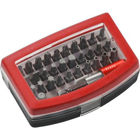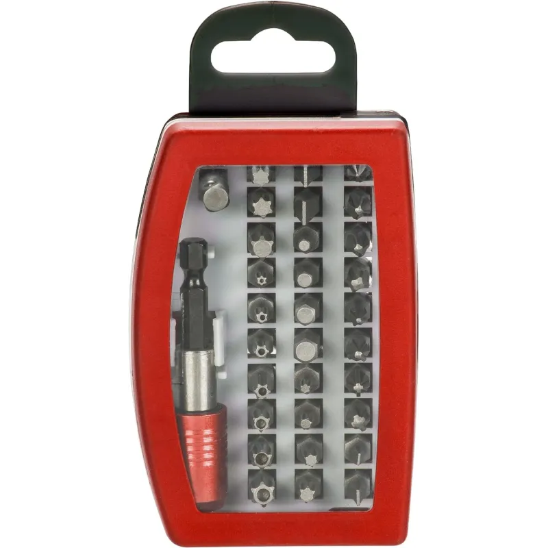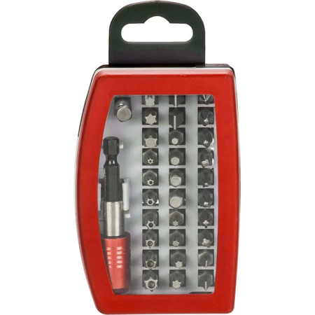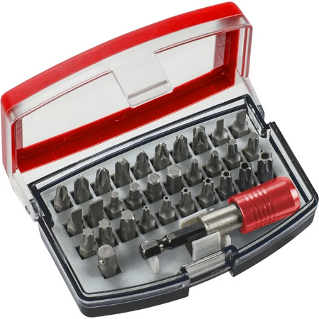 Conjunto de 32 bits em aço cromo-vanádio, em estojo de plástico de alta qualidade com prático clipe para cinto, 30 bits, encaixe hexagonal de 1/4" conforme ISO 1173, C 6.3, 25 mm, 1 suporte de troca rápida, 1 adaptador de soquete