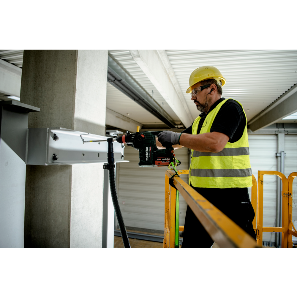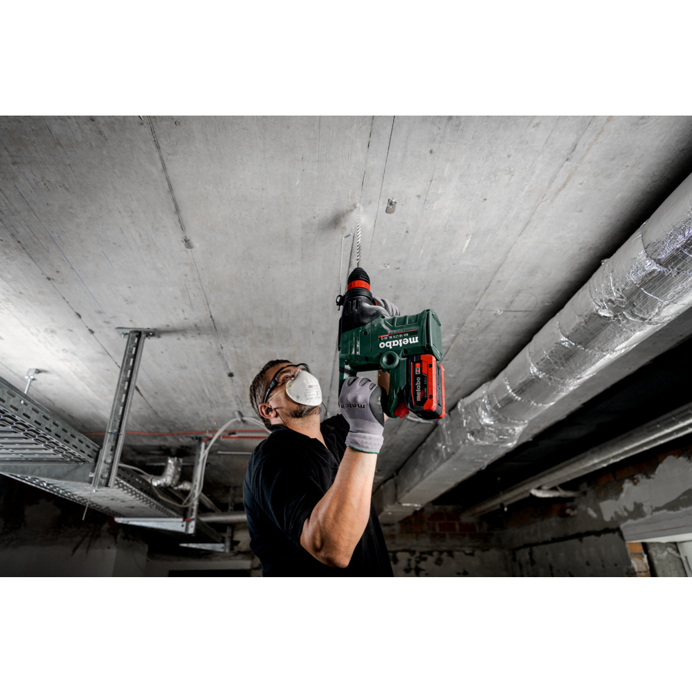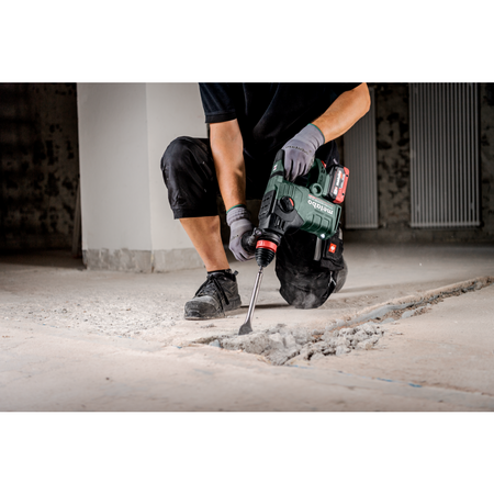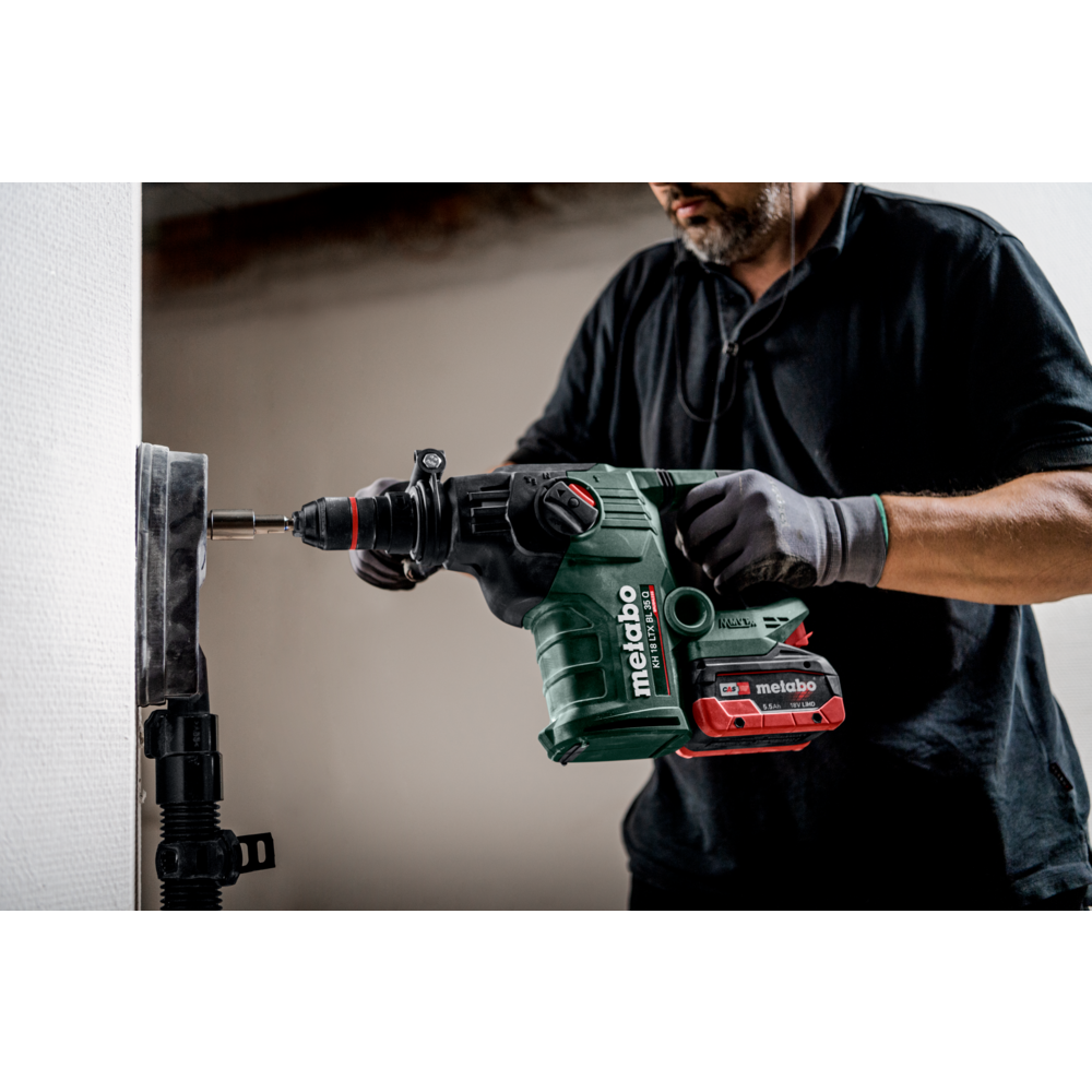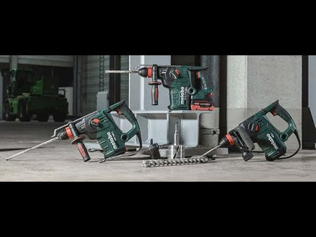 Martelo sem fio SDS-plus mais forte da Metabo, para furar rapidamente e demolir de forma eficiente em betão e alvenaria Potência máxima de furação, eficiência e durabilidade graças à tecnologia Brushless e ao mecanismo de percussão de elevado rendimento Martelo combinado com 3 funções: furar com percussão, furar e demolir Metabo VibraTech (MVT): sistema de amortecimento integrado para redução das vibrações e proteção do utilizador Ergonomia perfeita graças ao centro de gravidade próximo da mão e ao contorno do punho otimizado Metabo Quick: substituição rápida da bucha de percussão SDS-Plus pela bucha de aperto rápido, para muitas aplicações diferentes Comutável para rotação à esquerda para soltar, confortavelmente, ferramentas acopláveis emperradas Redução otimizada da velocidade e energia de percussão para perfurar e para trabalhos em materiais mais macios Proteção contra rearranque involuntário: previne o arranque involuntário após substituição da bateria Dupla segurança em caso de bloqueio da broca: sem contragolpes graças ao desacoplamento mecânico e desativação extremamente rápida comandada por sensor Luz de trabalho LED para uma visualização perfeita da zona a furar Muitas marcas, um sistema de baterias: este produto é combinável com todas as baterias de 18V e carregadores das marcas CAS: www.cordless-alliance-system.com