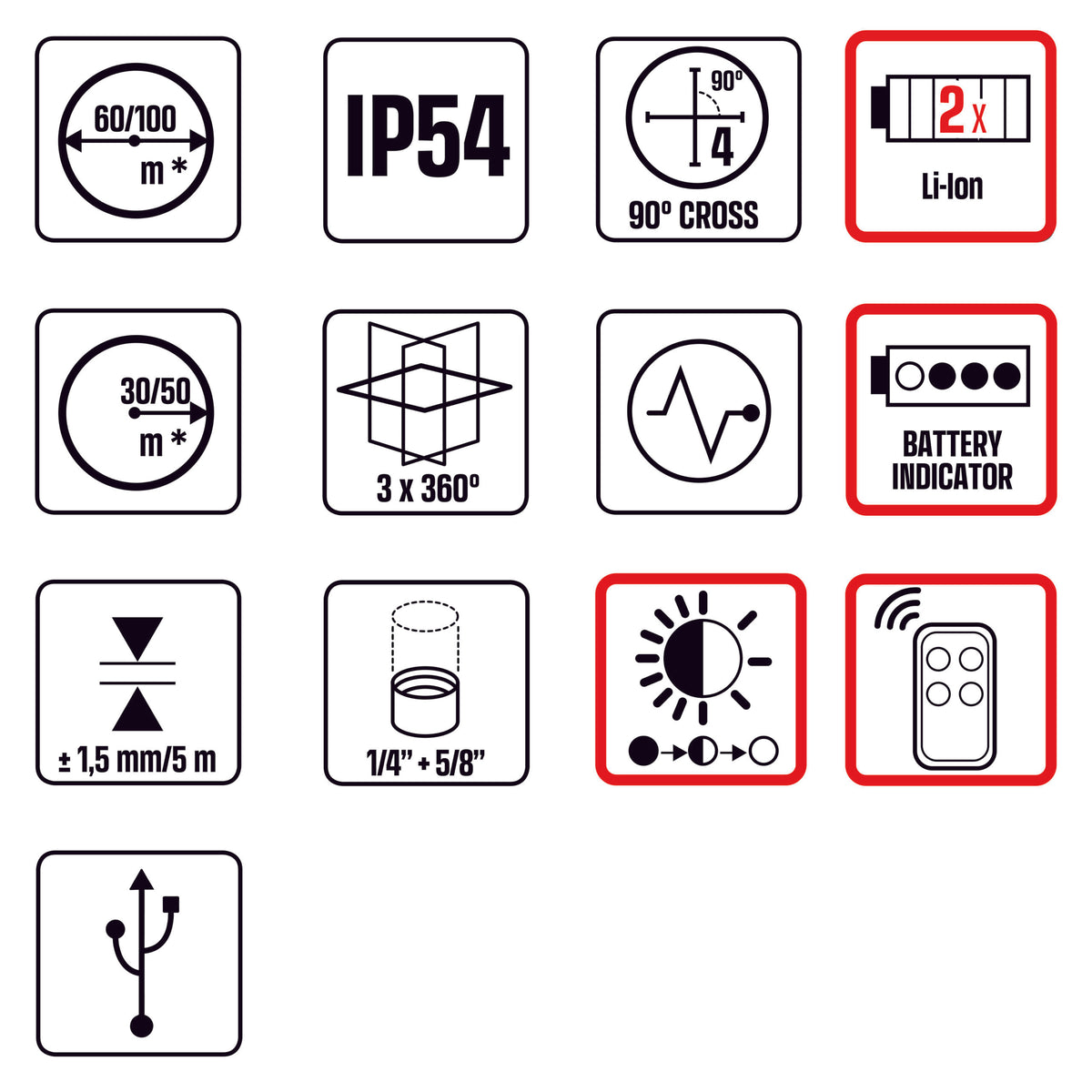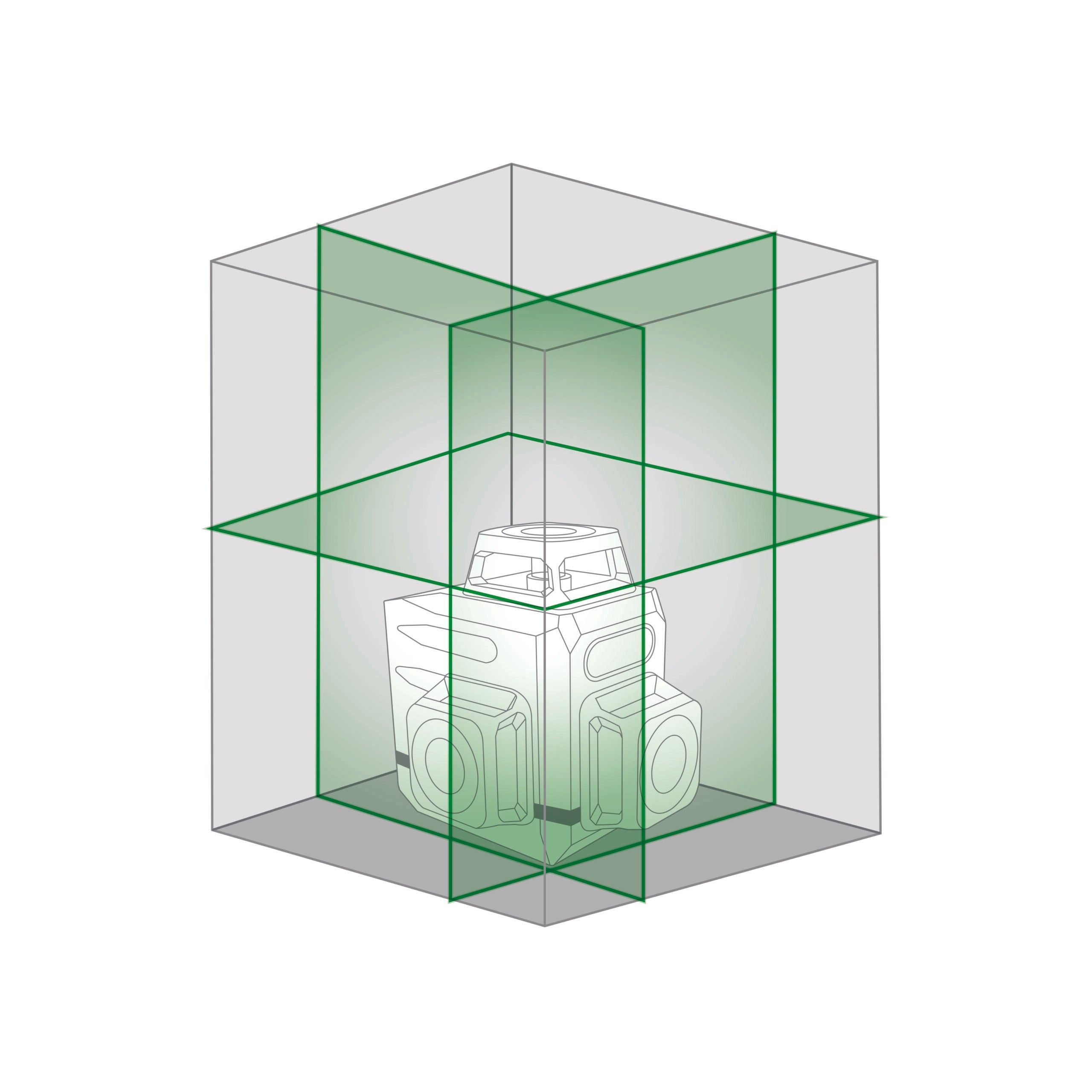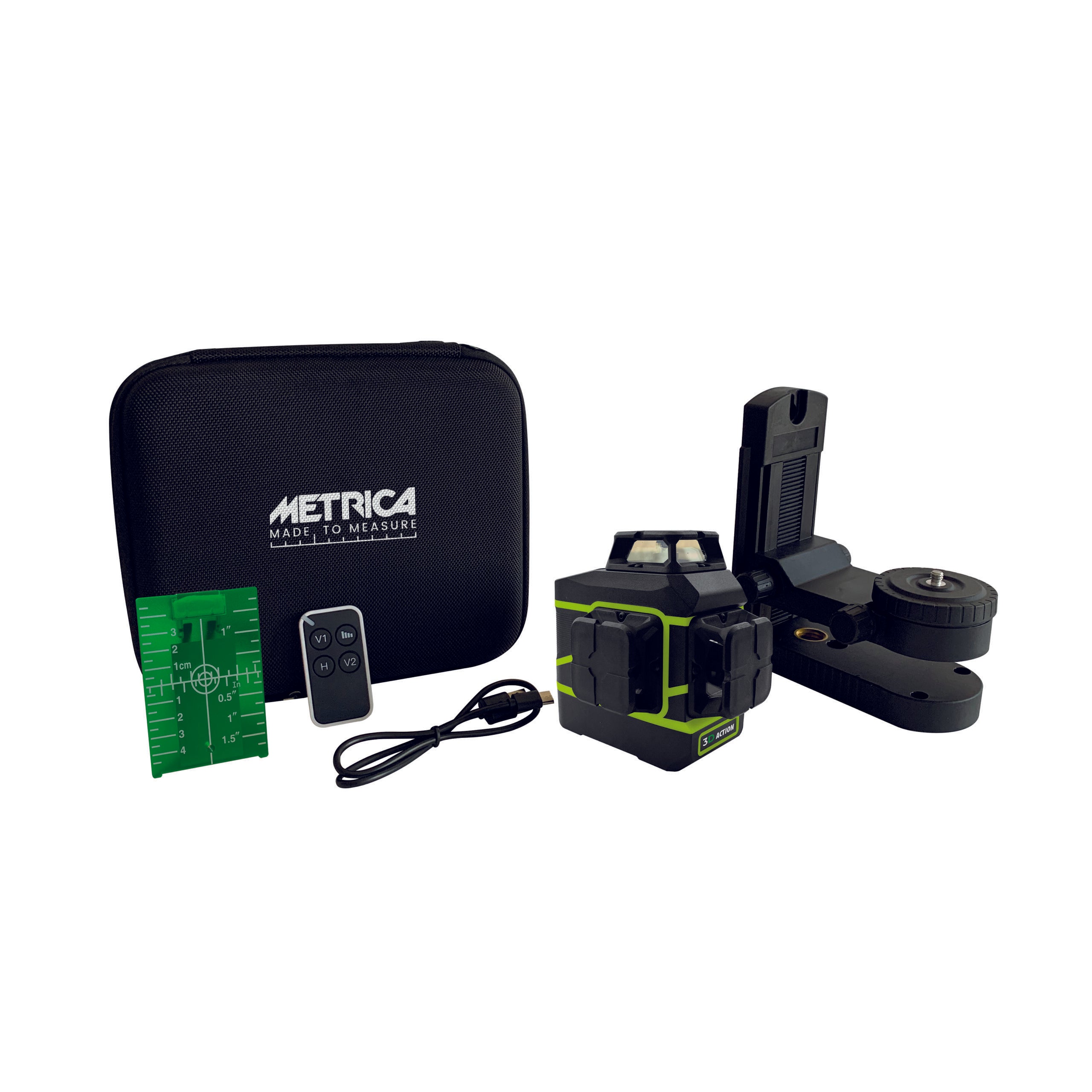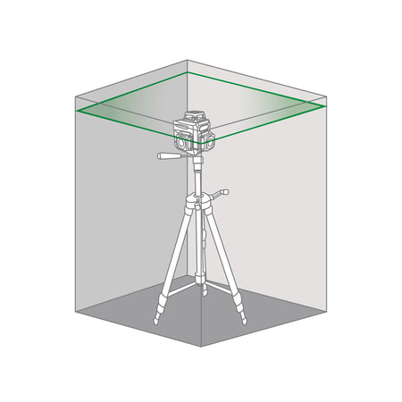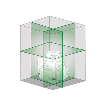Projeta 3 planos a laser em 360°: um plano horizontal e dois planos verticais. Inclui controle remoto, suporte magnético de parede, alvo, cabo USB e estojo. Uso interno/externo (receptor não incluído, código 60749) Fornecido com 2 baterias de íon-lítio recarregáveis ??através do cabo USB incluído.